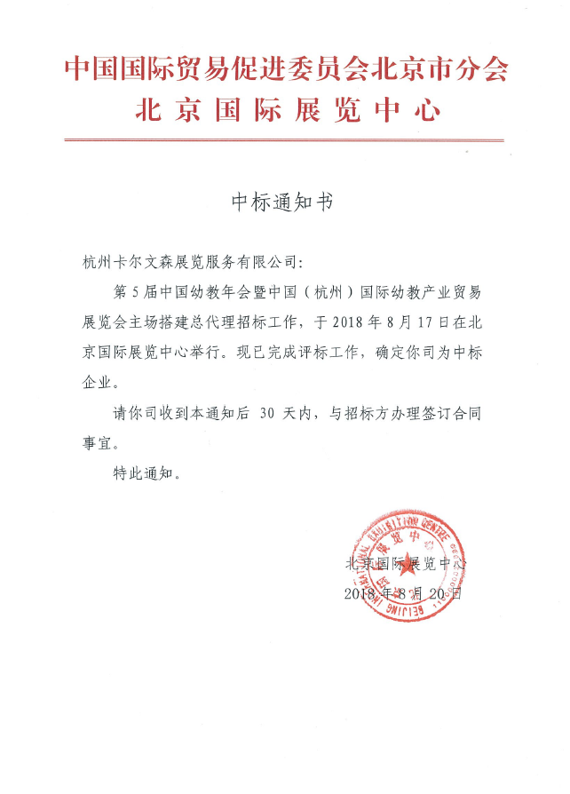 2018年8月20日,卡爾文森憑借自身的實力,在第五屆中國幼教年會暨中國(杭州)國際幼教產(chǎn)業(yè)貿(mào)易展覽會中標主場搭建總代理!